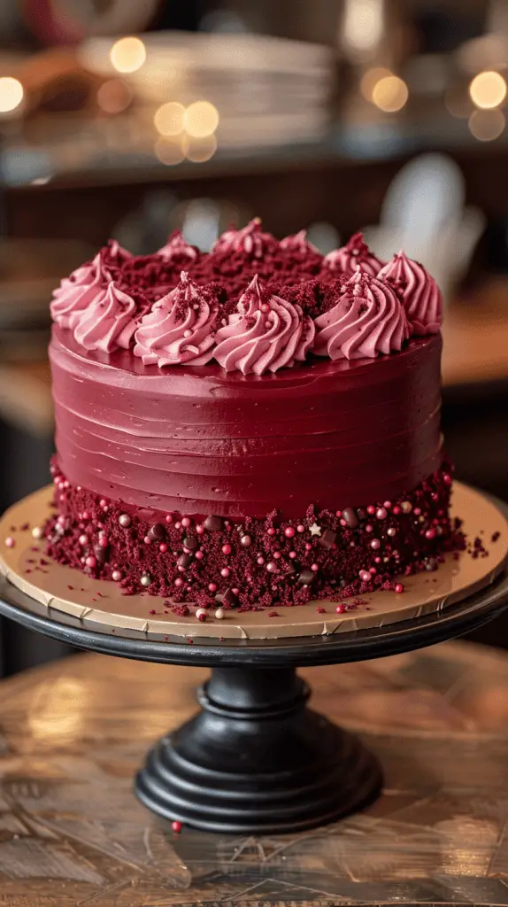 Decorations can range from a simple frosting spread to more elaborate designs with red crumbs sprinkled on top. This cake’s bold appearance and delicate taste make it a standout choice.